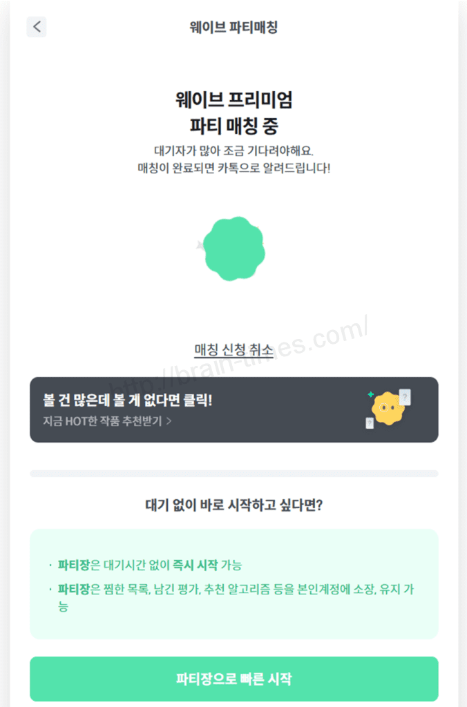 주중 업무 시간이나 새벽 시간에는 웨이브를 구독하려는 사람이 적어서 파티매칭이 늦어질 수 있다는 점을 참고하시길 바랍니다.