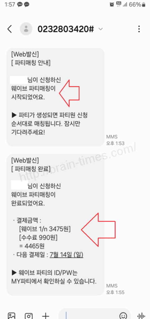 파티 매칭이 완료되면 SMS 문자가 발송됩니다.