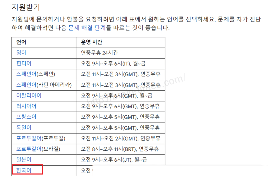페이지 하단에서 ‘국가별 고객센터’를 찾으실 수 있습니다. [한국어]를 선택해 주시기 바랍니다.