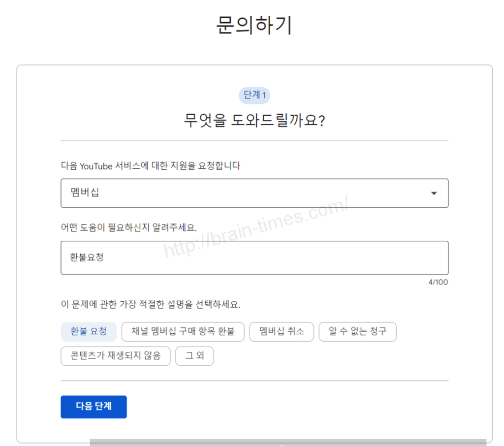 환불 요청을 입력하신 후 [환불 요청] 버튼을 다시 눌러주시고 [다음 단계]로 진행해 주십시오.